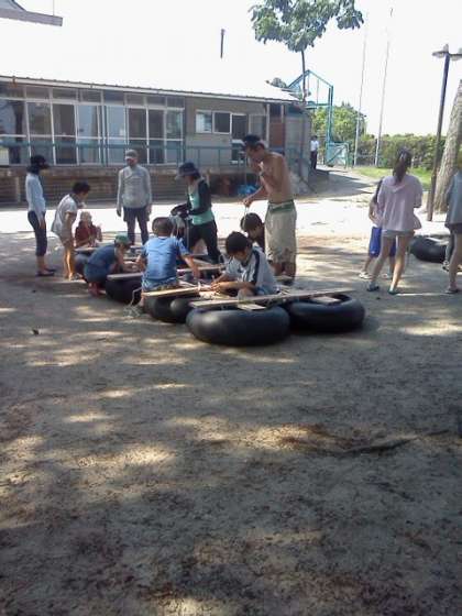 10個のタイヤチューブの上に板を格子状において,ロープでしっかり固定して縛ります。みんなで力を合わせて,いかだの完成です。