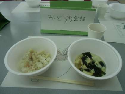 前日に収穫したたけのこを調理してできあがった若竹汁とたけのこご飯を,みなさんに味わってもらいます。会場準備や配膳もとても大切な役割で,児童生徒は,協力しておもてなしの準備をしました。