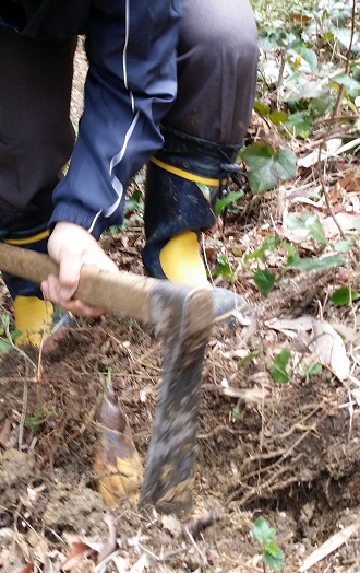 4月27日のふれあいタイム「タケノコ掘り」に向けて,いつも,学校林「まなびの森」の環境整備をしていただいている「みどりの会伏見桃山」のボランティアのみなさんのご指導・ご支援の下,タケノコの試し掘りをしました。今年は出る時期がずいぶん遅くなっているそうですが,短時間で30キロくらい収穫することができました。収穫を終えて谷から戻ってくると小学生たちがなつみかんを収穫していました。みどりの会の人たちが「蜂蜜と混ぜてジャムにしたらいいよ」と話しておられました。