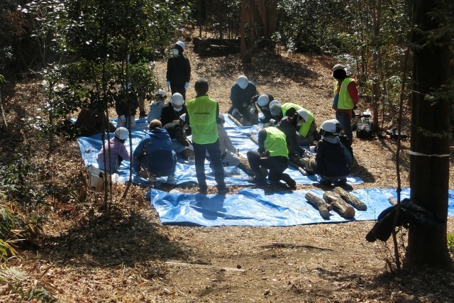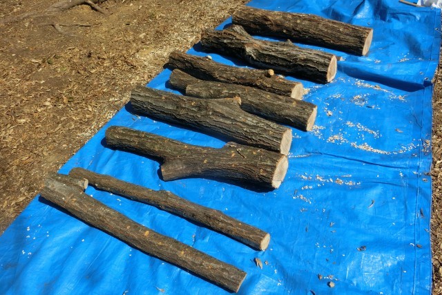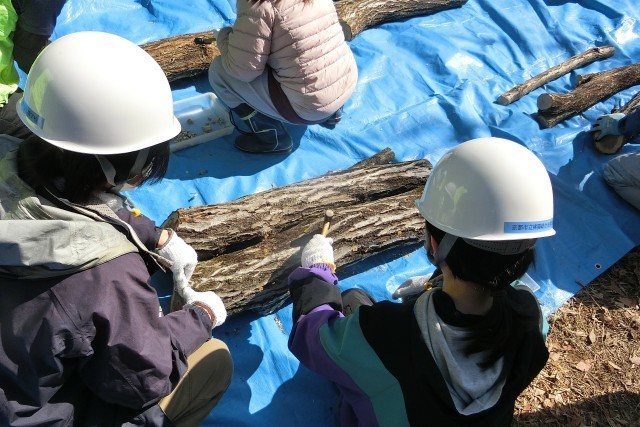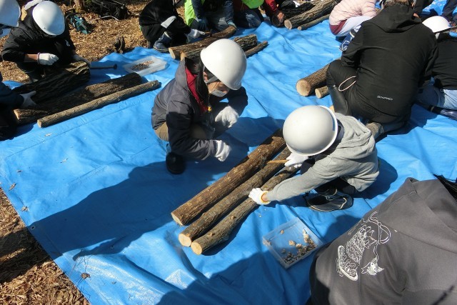 子どもたちが植菌活動を行いやすいように、事前にみどりの会伏見桃山の方々が全ての原木に穴を開けていただきました。