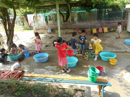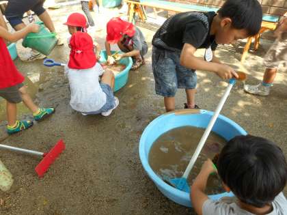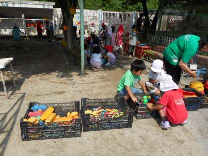 1学期の終わりに,今まで砂場で使っていたスコップやお皿などの道具をみんなできれいに洗いました。