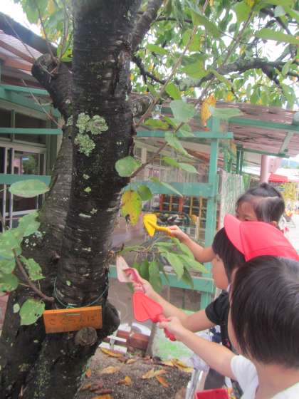 子どもたちは,4歳児なりの推測をし,4歳児なりの表現で友達同士の伝え合いを楽しんでいました。「これは樹液だよ」と教えるのは簡単です。だけどこのような姿はきっと見られないでしょう。「何だろう?」と思った時に追求してみたくなる気持ち,正解に行きつかなくても自分なりに考えてみる姿を大切にしたいと思っています。