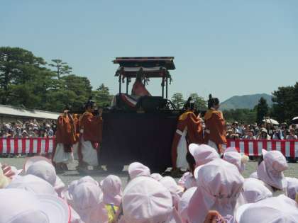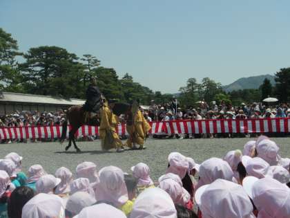 幼稚園Tシャツでお馴染みの「フタバアオイ」をお祭の人たちは身に付けていて,「頭についてる!」「あそこにもつけてる」と、親しみをもつことができました。