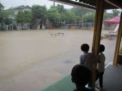 子どもたちも驚いてテラスへ出てきて,この光景をじっと眺めていました。いつもの雨とは違う大きなエネルギーをもった雨の力に心が動きました。