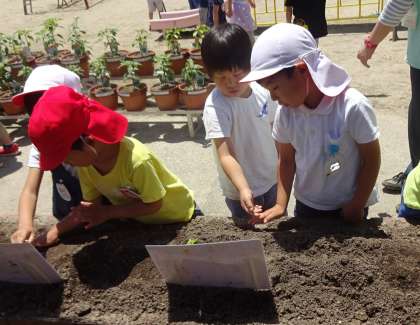 年少組と年長組のなかよしグループで1つの苗を植えました。