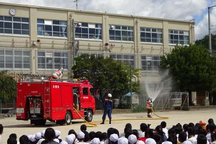 そのあと,消防士さんの出動準備や放水作業を見させてもらいました。きびきびと動く消防士さんの姿に,「すごい」「かっこいい」という声が聞こえました。