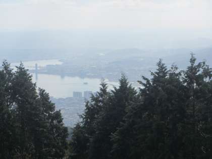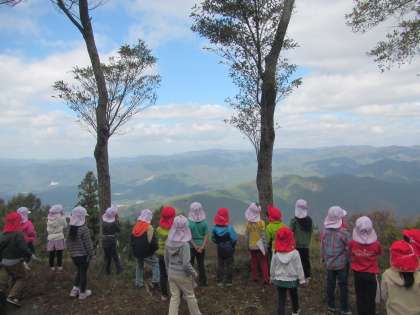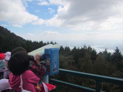 山頂につくと,琵琶湖がきれいに見えました。琵琶湖が見えることを知らせると,「行ったことある!!」と喜んでいました。覗いても見えない双眼鏡を覗いてみたり,自分の目で遠くに見える橋を確認したりしていました。
