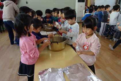 そして次はやきいもにするために,キッチンペーパーとアルミホイルでおいもを包みます。自分たちの手より大きいおいもを,ぎゅっぎゅっと丸めていきます。