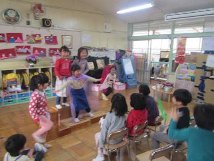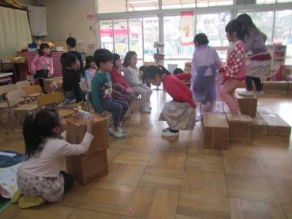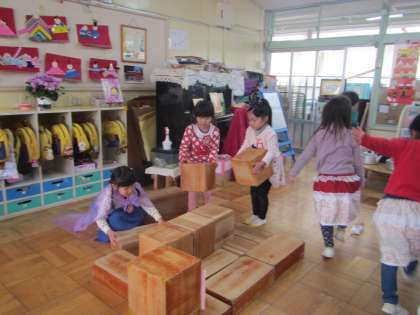 大好きな「エルサの歌」をアカペラで生き生きと歌ったり踊ったりする姿だけで十分楽しいのですが,その合間にAちゃんが積木を動かしたり足したりし始めると,階段が出来てよりステージっぽくなるなどステージが変化していきます。それを見ていた周りの友達も,よりよいステージにすることに意識が向き,一緒にし始めました。こういう工夫や楽しいことはすぐに伝染するもので,仲間が増え,さらにカメラマンまで現れました。