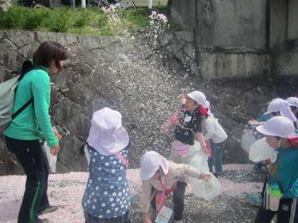 よいお天気の中,賀茂川に散歩遠足に行きました。ピンクや黄色や青色の小さい花を見つけては喜んで摘んでいました。土日に散った桜が散歩道にたくさん積もっていて,「花咲け〜」と花坂爺さんになって花びらをふわっと投げたり,桜吹雪が風にのってきれいに舞うのを楽しんだりしていました。よもぎはよ〜く見ないと見つからないほど小さく,こどもはよく発見できたなと感心しました。「これでよもぎパーティできるな!」と団子つくりを楽しみにしているようです。