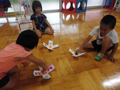 午後からは部屋の中で紙コップや牛乳パックを使い,少し時間をかけて手作りのおもちゃを作っています。
