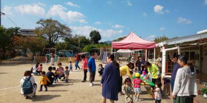 上賀茂幼稚園と楽只保育所の子育て支援合同事業を開催しました。今回は上賀茂幼稚園のひよこ組に加え,上賀茂児童館からもたくさんの親子が来園してくれました。いろいろな形のシャボン玉作りに挑戦しました。快晴の空のもと美しいシャボン玉がたくさん青空に向かって飛んでいきました。
