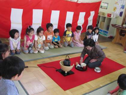 朝はお外でおもいっきり遊んだり絵具をしたりして,お弁当を食べたあと,すみれ組(年長組)はお茶会をしました。