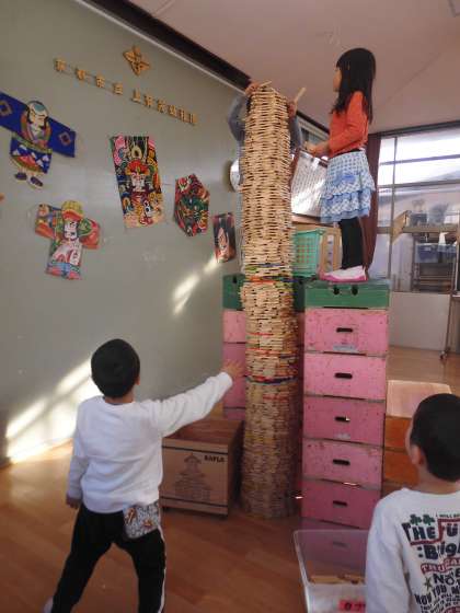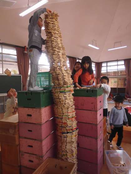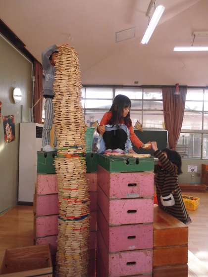 「いれてー!」と,他の子ども達も加わり,気がつくとカプラの高さは頭を超えていました。巧技台・大型積み木を階段のように積んで,その上にのぼってどんどん積み上げました。