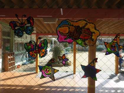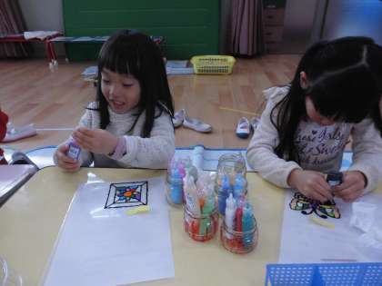 絵の具が乾くと透明になり,ステンドグラスの様に見えます。