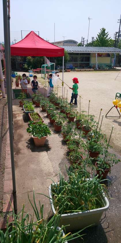 興味津々,園庭を走り回って追いかけて楽しんでいます。
