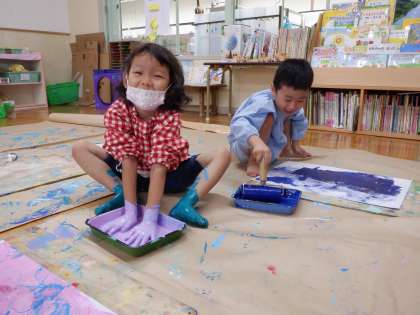 ゆり組になって初めての絵の具遊び。“この色が好きなんだ”“友達がいると楽しくなるよね〜”“一人でじっくり遊んでるな。夢中になれるって素敵だな”など,子どもが楽しんで遊ぶ姿を見ていろいろなことを感じました。見ている私も楽しかったです。また絵の具遊びしようね!
