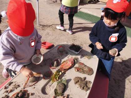 拾ってきたドングリ,きれいに色づいた柿やイチョウの葉,南天の実も使って,ウサギや恐竜のクッキーも作りました。