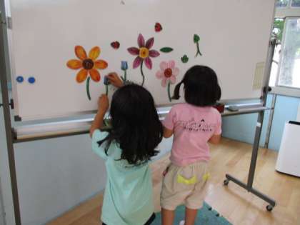 ホワイトボードに色々な形や色のマグネットの色板をくっつけて楽しい模様遊びをしました。