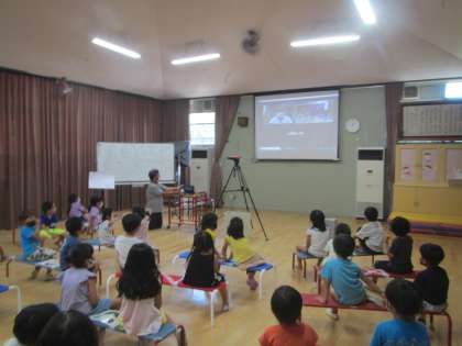園でたくさんの賀茂川の生き物を飼っています。ヌマチチブ・ザリガニ・スジエビ・ヨシノボリ・オイカワ生き物に興味を持った園児たちがいろいろ博士に聞いてみたい!そんな思いから本物の博士に聞くことになりました。