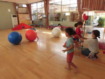 秋らしい風が吹いている広い園庭でひよこ組のおともだちとも遊びました。 お遊戯室でも体を動かして遊びましたよ。