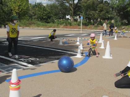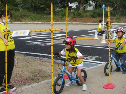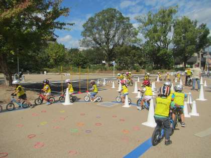 ゆり組は,子ども自転車教室に参加しました。ヘルメットやビブス,手袋をつけて,準備はばっちり!楽しくゲームなどで教えてもらっているうちに,だんだんと感覚をつかんで乗れるようになってきた子どもたち。危ないときは周りをよく見てブレーキで止まったり,狭い所や障害物に気をつけたり・・。