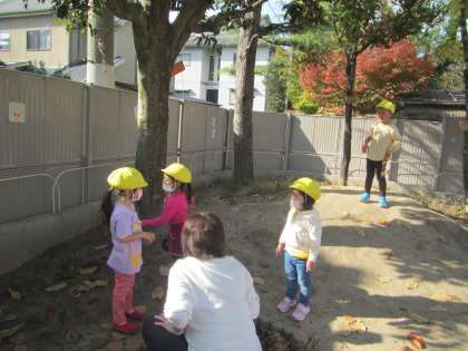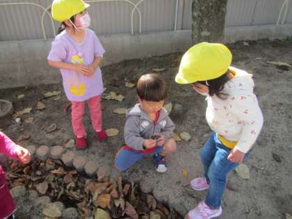 園庭の木も色づいてきました。どんぐりや葉っぱも見つけましたよ。