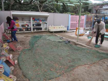 先生たちで,3学期の準備をしています。砂場や園庭,保育室などのお掃除をしました。