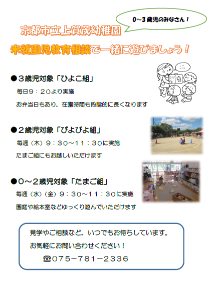詳しくは,こちらのホームページにてお知らせいたします。ご相談や見学なども,まずはお気軽にお問い合わせください! (☎ 075-781-2336)