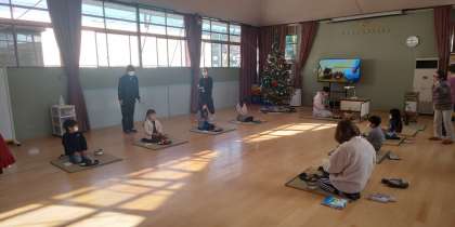 年長ゆり組のお茶会の様子です。先生のお点前が良くわかるように、教材提示装置と大型テレビで、確認しながら真剣なまなざしで、ゆり組の園児が一生懸命お茶をたてました。