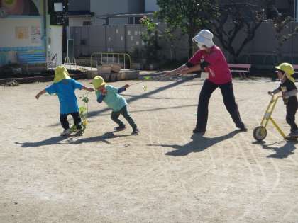 大きなかぶみたいに「よいしょ!よいしょ!」と力を合わせて引っ張る子どもたち。「大きいのがとれたよ!」と大喜びの子どもたちでした。
