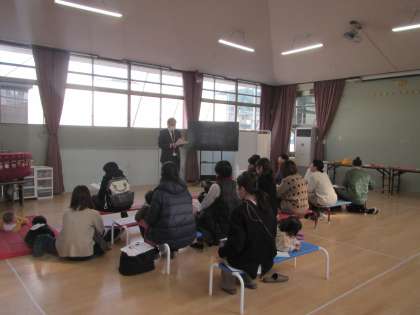 4月にご入園予定の方を対象に、入園説明会を行いました。すでに3歳児ひよこ組に通っていただいている方が多いのですが、改めて幼稚園や物品等についてお話をしました。