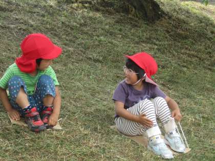 自分の好きな滑り方で楽しんだり,友達と一緒に滑ったり…,組を超えて同じダンボールに乗ったり…。