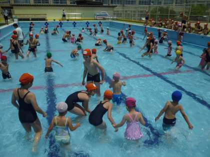 小学校との交流は2回目になります。今日は小学校のプールに交流している5年生と一緒に入れるということで、年長組すみれ組の子どもたちはとても楽しみにしていました。
