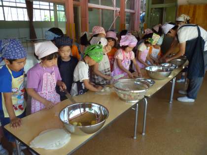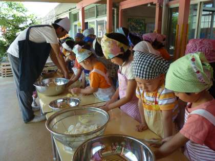 包丁を持って真剣な様子です。幼稚園のみんなの分なのでとてもとてもたくさんの野菜でしたが一生懸命に切ってくれました。暑い日でしたが,そのたくさんの野菜を炒めてもくれました。