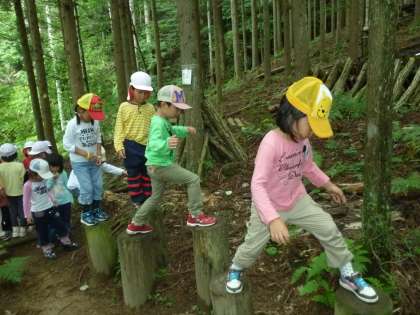 おにぎりを食べて元気いっぱいになった後,アスレチックへ行きました。丸太渡りやくもの巣潜りなど,木やロープでつくった遊具がいっぱいありました。