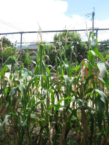 幼稚園の野菜たちは,暑さに負けずぐんぐん葉っぱを茂らせて,おひさまパワーをいっぱいに受けています。