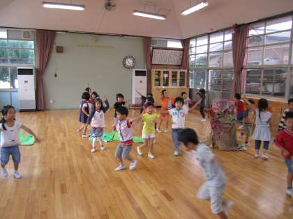 魔女と同じくらいちゅうりっぷ組さんが楽しんでいるのは「虫たちの運動会」です。虫が大好きなみんなは虫になって遊ぶことが楽しくて、虫に出会うたびになりきって遊んでいました。とんぼのようにすいーと早く飛んだり、バッタになって高いジャンプに挑戦したり、カブトムシやクワガタムシの力比べのお相撲をしたり…最後にはオオカマキリさんがきて一騒動…。さて、どうなることやら、お楽しみに!