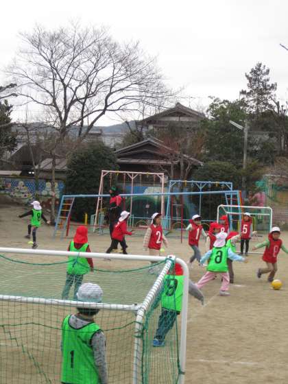 降園準備をしていると「今日はサッカーやし先生見ててな」と,やる気まんまんの子どもたち。預り保育にサッカーの先生が来てくださるのを楽しみに待っているのです。大きくて少し硬いボールを蹴るのが得意なようです。寒い中でしたが,声援も元気いっぱいでした。回を重ねるたびに動きがすばやくなっていることに驚いています。