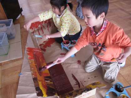 大好きな「でてきて おひさま」のお話の中のはりねずみになって遊んでいるちゅうりっぷ組の子どもたちが,はりねずみが住んでいるぶなの木のおうちをつくっています。「ぺたぺたぺたぺた…」「あったかい木にしよう」と色を重ねていました。全身で表現遊びを楽しむみながら自分のイメージをかたちにしていく楽しさも味わっているようですね。