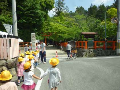 年少のちゅうりっぷ組が,初めてのお出かけです。大田神社の前を通って,車に気をつけながら歩きました。行列の出発まで時間があったので,小学生が笛の練習を聞かせてくれました。
