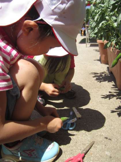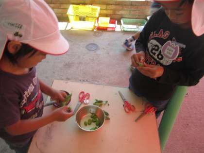 エンドウ豆に続いて今日は大きくふくらんだソラマメも発見しました。さっそくさやを開けると「うわあ、ふわふわや」「ほんまにそらまめくんのベッドやなあ」「気持ちいいなあ」「ここに入りたいなあ」「ほんまやあ」[あこがれるなあ」とさやの中の感触を楽しみながら、絵本のそらまめくんの世界に入り込んだひとときでした。