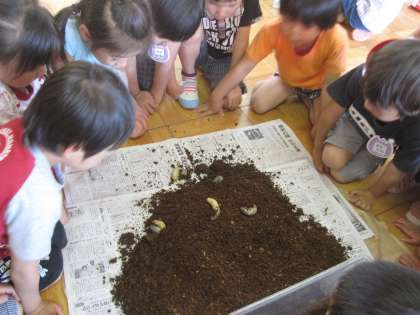 かぶと虫の幼虫のケースにうんちがいっぱいになっていたので、マットを交換しました。以前に出会ったときよりさらに大きくなっていますが、一緒に暮らしている中で親しみを感じているようで「もちたい」「さわりたい」と声が上がり、みんなで順番に手袋をして、そおっと手のひらにのせました。「やわらかい…」「顔はかぶと虫やなあ」と顔を近づけたり、「これがうんち?」「くさくないなあ」「いっぱいしてる」と、ころころしたうんちに驚いていました。