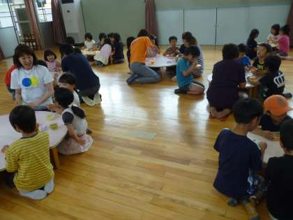 写真は,みんなでゼリーを食べている様子です。上賀茂幼稚園から上賀茂小学校,柊野小学校,大宮小学校など…,さまざまな小学校へ行っています。久しぶりに出会って話が盛り上がりました。