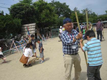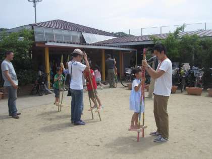 すみれ組は今日の休日参観でおうちの方と一緒に竹馬をつくりました。できあがると早速お父さんやお母さん、おじいちゃんに持ってもらいながら乗っていました。おうちの方につくってもらった竹馬を、おうちに持って帰る子どももいました。竹馬の楽しさをいろいろ見つけようね。これからが楽しみです。