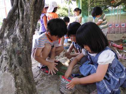 うさぎ組のお母さんからかたつむりをいただきました。でもかたつむりのおうちをどのようにつくったらいいか分かりません。年長のすみれ組のおにいさんに聞きに行くことにしました。