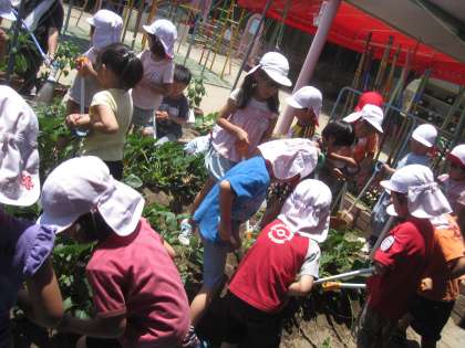 おいしいいちごをたくさん食べさせてくれたいちご、このごろ実が大きくならなくなってきました。「いちごは春のものやから暑いのは苦手なんちがうか」「ひまわりは夏が好きやけどなあ」とみんなが話していました。この前植えたポップコーンの芽が大きくなってきています。そこで、畑の入替えをしました。いちごを大切に抜いて栄養や腐葉土をいれて耕しました。今度はどんな畑になるかな…。楽しみですね。