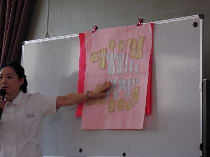 親子歯みがき指導の後半は,保護者を対象に歯科衛生士の高内先生と歯科医の金谷先生からお話をしていただきました。幼児期は子ども自身の歯磨きの習慣がついたり,歯磨きが上達したりする時期です。子どもが歯磨きをしているときは声をかけ,上手にできていたらほめてあげてくださいね。ご参加,ありがとうございました。