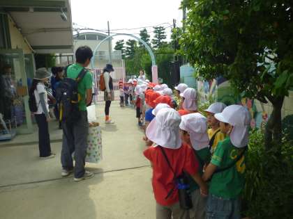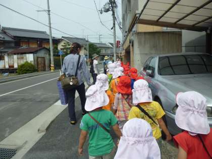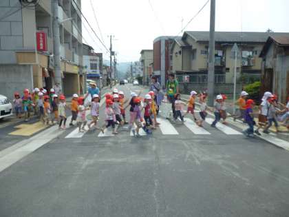 まずは,すみれ組とちゅうりっぷ組と手をつないで出発。車に気をつけて道路の端を歩きます。横断歩道は特に気をつけて…。