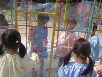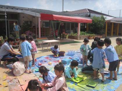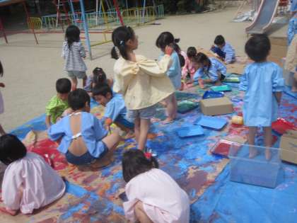 青空の下で、全身をつかって遊ぶ気持ちよさを感じたり、いろいろな素材や用具で試したり工夫したりして思いきり遊びました。はじめは遠慮がちだったちゅうりっぷ組さんもすみれ組さんにつられて、どんどんダイナミックに絵の具と遊んでいましたね。